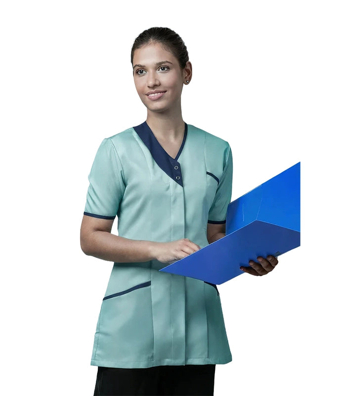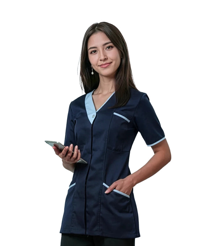 - Asymmetric V-neck with contrast trim